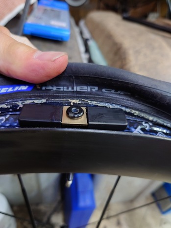 取り付けは、チューブレスバルブの シールゴムと本体の間に挟みこむだけ。